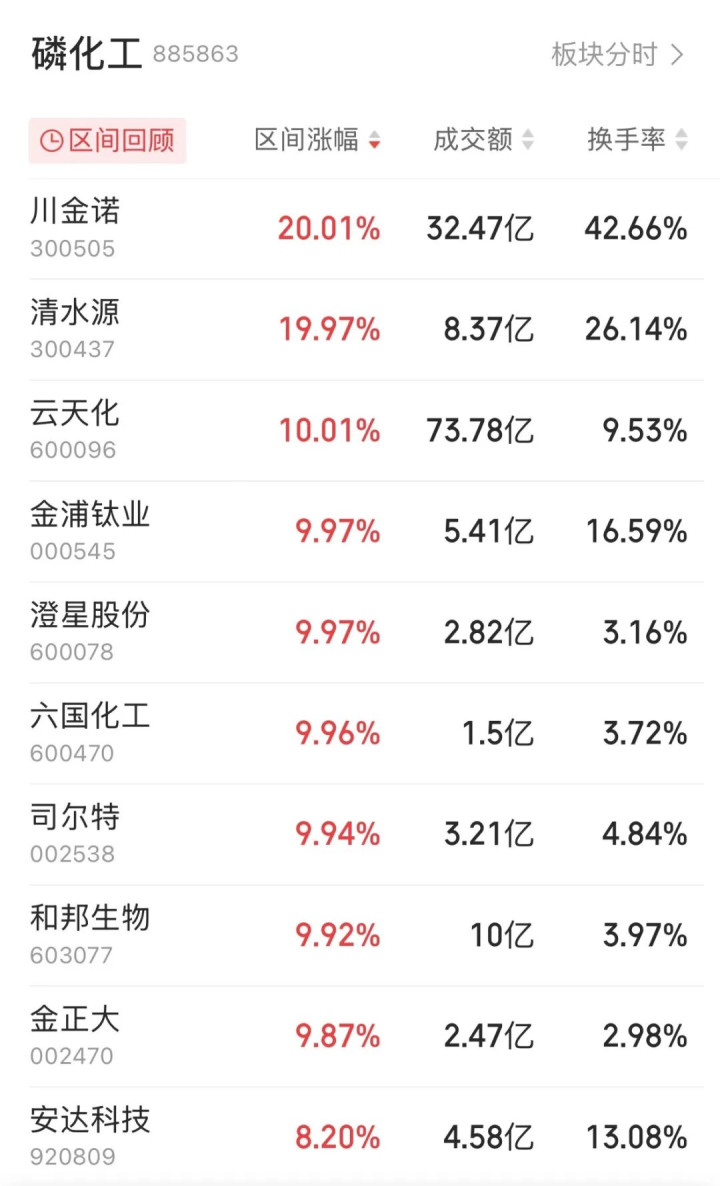 万里之外的中国资本市场,45只磷化工概念股全线飘红,涨停板都快被挤爆了。